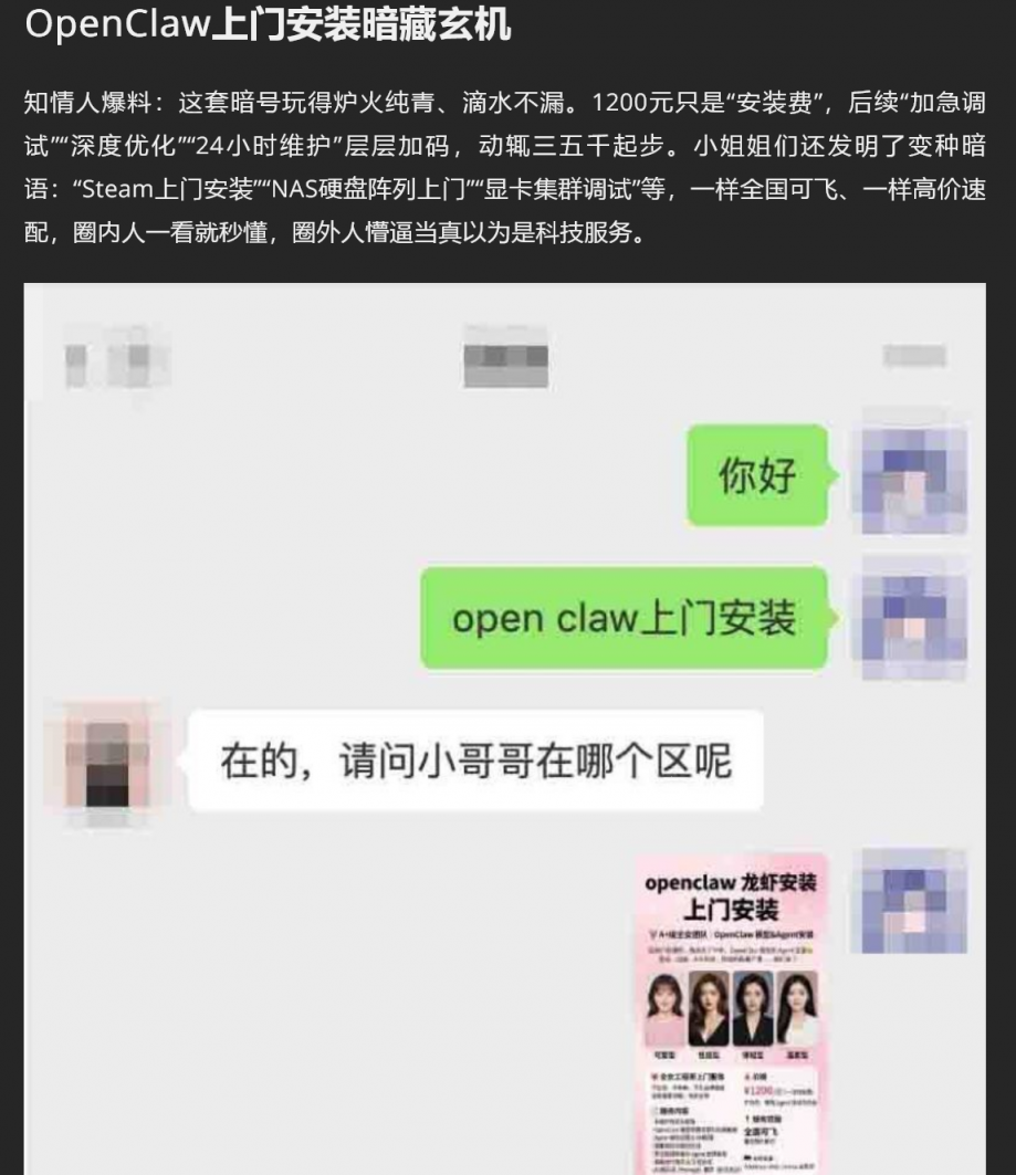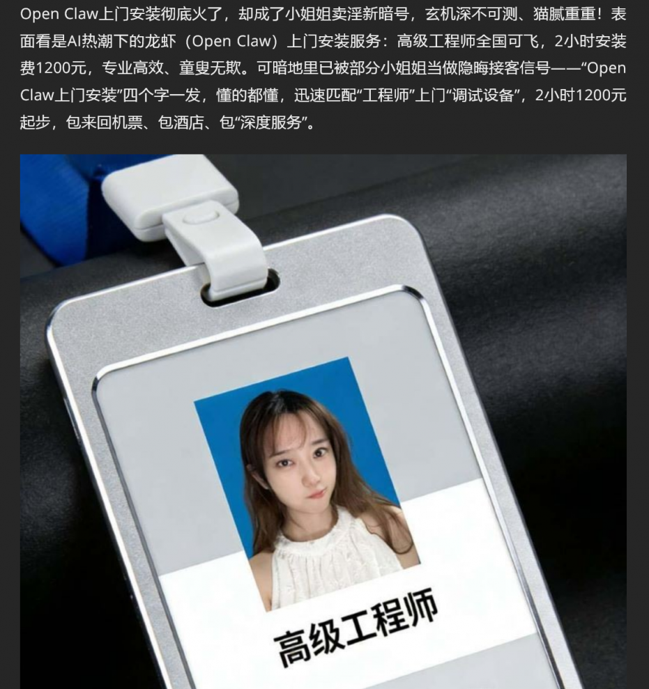 【5】❤️OpenClaw上门安装 卖淫暗号再度升级 美女工程师2小时1200元全国捞金 掀起全网AI狂潮!
