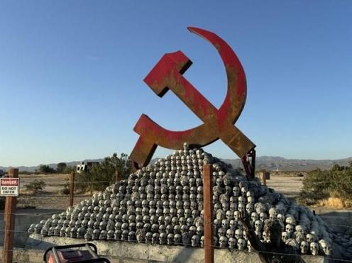 2025年1月6日,一个揭示共产主义危险的雕塑于矗立在加州15号公路旁,在一堆夹杂几个人头的骷髅石雕上,是一个巨大的共产标志,代表共产主义只会带来死亡与灾难。